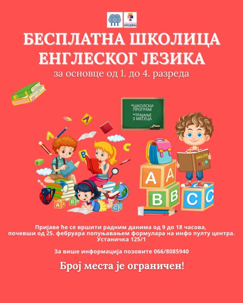 Ustanova „Voždovački centar – Šumice” organizuje besplatnu školicu engleskog jezika za decu od 1. do 4. razreda osnovnih škola, u trajanju od tri meseca, saopšteno je iz UVC-a „Šumice”.